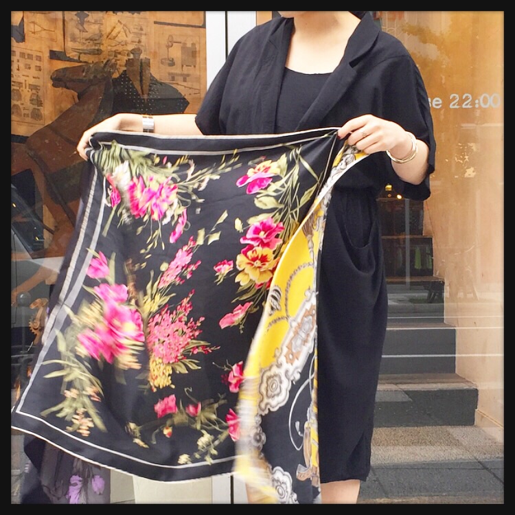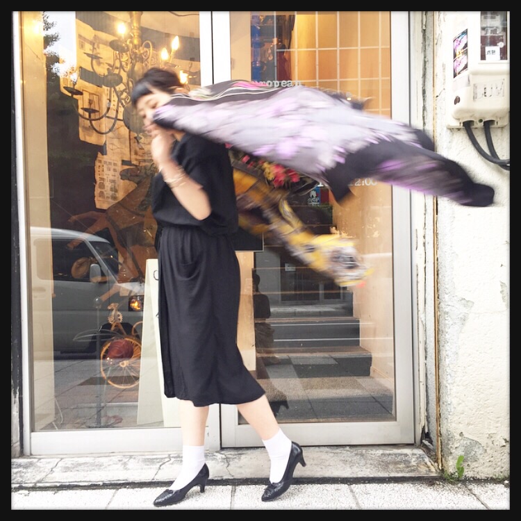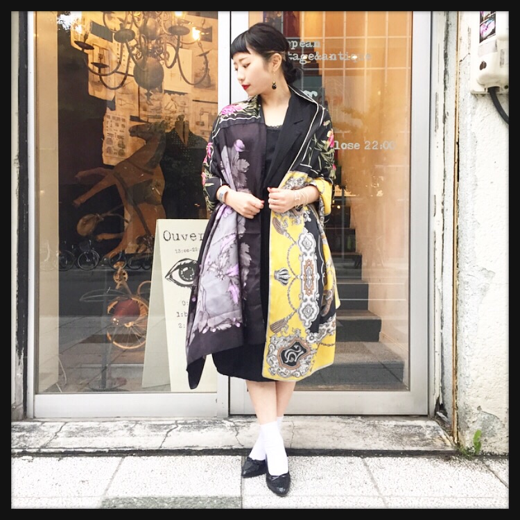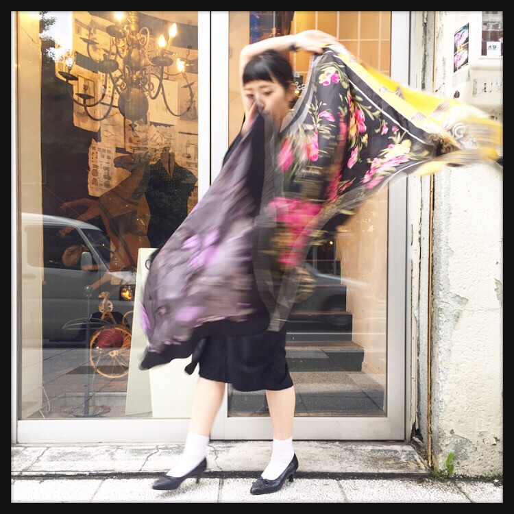 3枚のスカーフを組み合わせたオリジナルのストールは、今日のように肌寒いときにさらっと羽織れるのでおすすめのアイテムです